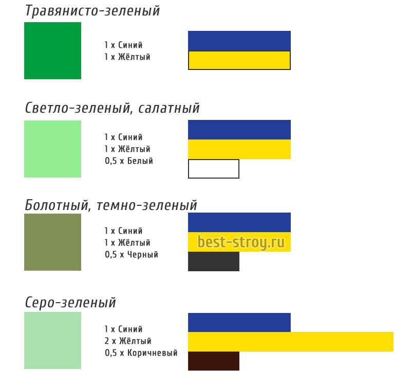 Зеленого цвета можно добиться, смешав в равных долях желтый и синий цвет. Получится травянисто-зеленый оттенок. Если к нему добавить белый цвет — смесь будет светлеть. Примешивая коричневый или черный пигмент, можно добиться изумрудного, болотного, оливкового, темно-зеленого оттенка.