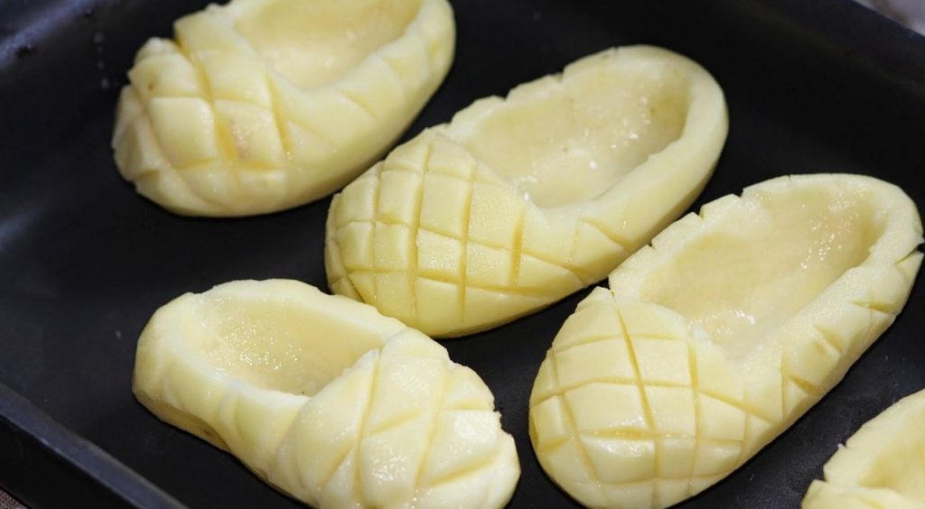 Средние клубни моют и чистят. На клубне делают поперечный надрез. С помощью ножа и ложки формируют «лапоть» (рис. 15). На «носке» делают неглубокие поперечные и продольные разрезы. Лапти фаршируют, смазывают сливочным маслом и запекают в духовке.