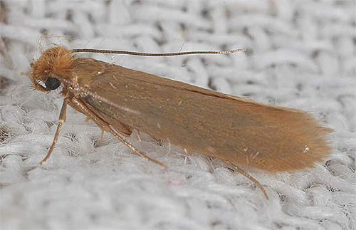 - Комнатная моль. Размах крыльев этих насекомых порядка 16 мм. Отличается светло-бежевым оттенком, с золотистым блестящим налетом. Она встречается в складках одежды, а личинки питаются волокнами из натурального материала. Личинки отличаются достаточно маленькими размерами — до 1 мм, когда они появляются на свет, но уже через 2 недели они вырастают в длину до 12 мм. Чем комфортнее условия, тем быстрее развиваются личинки. Взрослые особи слетаются вечером к источникам света.