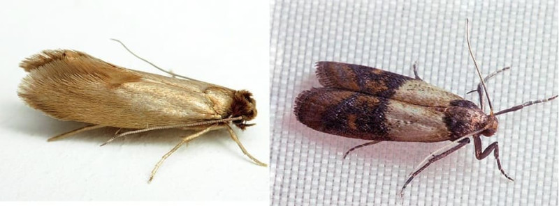 Пищевая моль меньше по размеру, чем платяная, и имеет более темный цвет, приближающийся к темно-коричневому. Их размер тоже вдвое меньше. И одежда, и пищевая моль летают близко к тому месту, где находится главный очаг инфекции. Траектория их полета также характерна только для этого вида. Часто это спираль или восьмерка. Во время полета моль может ненадолго зависнуть в воздухе, как бы дрожа. Что касается личинок обоих видов, то они похожи друг на друга. Единственная разница в том, что личинка паразита, заражающего вещи, производит тонкую паутину, которая служит основой для кокона. Также вокруг пораженного участка видны разноцветные песчинки. Это окрашенные экскременты личинок, их цвет зависит от цвета красителя ткани.