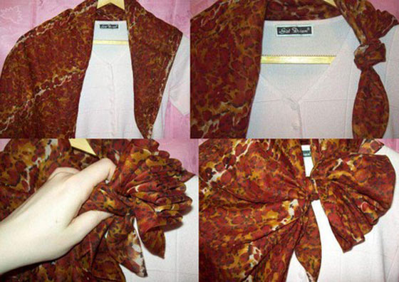 Здесь нам пригодится длинный шарфик средней длины, его нужно перекрутить в жгут и обмотать шею пару раз. Края тщательно завязываем и прячем в складки. Если сегодня у вас игривое настроение, то сделайте очаровательный бантик.