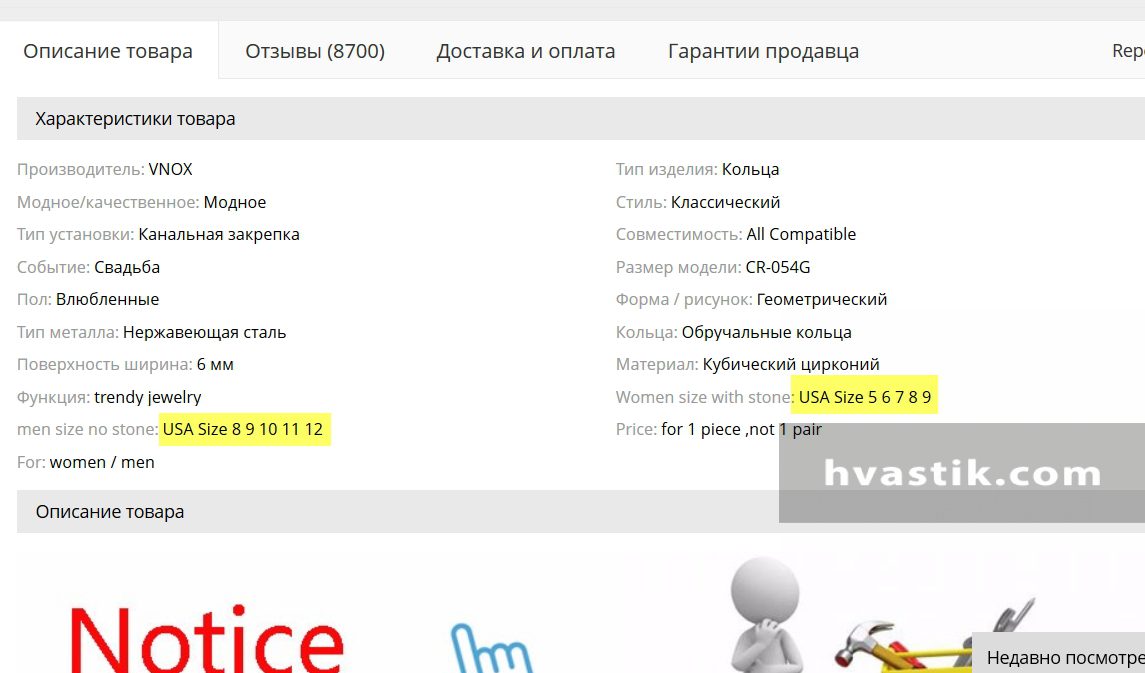 В строке предложенной таблицы нужно найти свои данные и отыскать размер в нескольких размерных сетках. Например, размер кольца на алиэкпресс 6 – соответствует русскому 16,5..17; размер кольца 7 на китайских сайтах – 17,5..18 в России, 8 и 9 на «али» – равны 18..18,5 и 19..19,5 соответственно по русской шкале размеров колец.