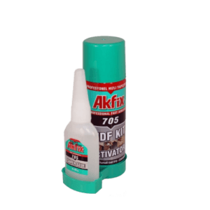 Akfix 705 клей для экспресс—активации продается в упаковке, включающей два компонента: 50-миллиметровый флакон с клеевым раствором и 200-миллиметровый аэрозоль активатор.