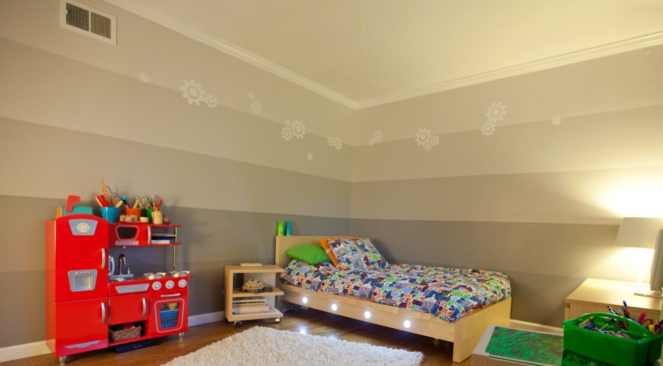 На этом окраска стен в выбранном стиле закончена. Цвета можно выбирать абсолютно любые, исходя из своих личных предпочтений и вкуса.Градиент на стенах может становиться интенсивнее как возле пола, так и возле потолка. Интересно и необычно будет выглядеть градиент не горизонтальный, а вертикальный. Можно создать градиент, используя необычное сочетание цветов, например, зелёного и розового.