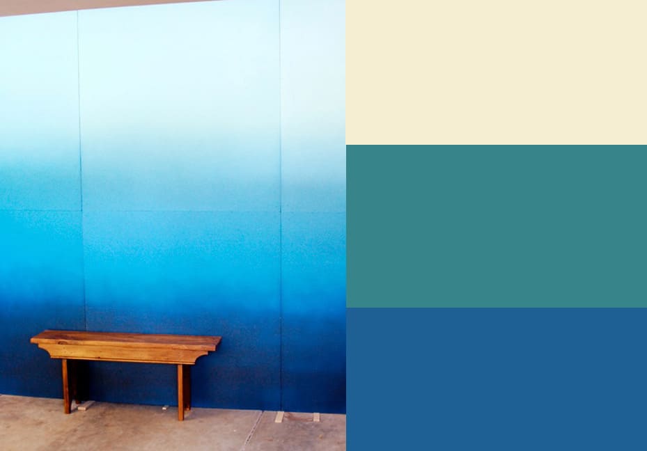1. Укрываем мебель (для этого лучше использовать полиэтилен), малярным скотчем и кусками клеёнки закрываем стены и потолок, которые не требуют окраски. Пол можно застелить старыми обоями или бумагой.2. Приступаем к прокраске. Первым делом наносим самый светлый оттенок. Используя валик, окрашиваем всю стену в светлый оттенок. Наносим несколько слоёв краски, это обеспечит хорошую базу.3. Наносим самый тёмный оттенок. Для этого стену нужно разделить на четыре примерно равные части и самую нижнюю четверть окрасить в тёмный цвет. 4. Далее будем делать переход от тёмного оттенка к светлому. Для этого нужно смешать эти оттенки и валиком нанести выше тёмной линии, немного на неё заходя.5. Следующую четверть стены окрашиваем в оттенок средней интенсивности. 6. Создаём плавный переход между светлым и средним оттенками. Чтобы сгладить чёткую линию между оттенками, смешивать их не нужно. Достаточно валиком сделать более мягкие прикосновения на границе цветов и эффект градиента будет готов.7. Создаём мягкие переходы. Кисточкой с мягкой щетиной проводим по невысохшей краске, тем самым смешивая тона и придавая им более мягкий переход.