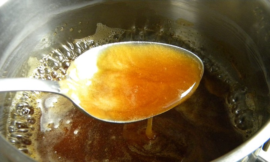 - Продолжайте нагревать сахар, пока он не станет плотным и не станет янтарным.
