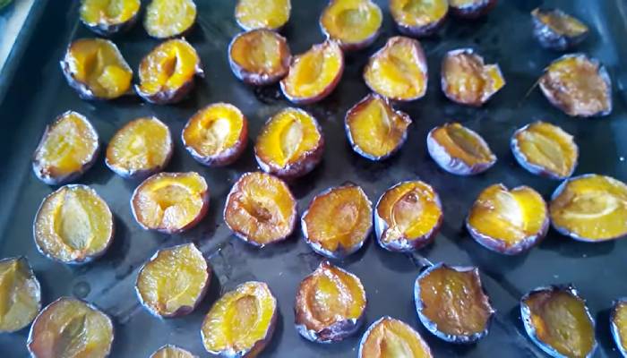 1. Сливы режем пополам, удаляем косточки. Раскладываем на противень, накрываем марлей. Сушим на свежем воздухе на солнце. Я разложил на крыше гаража, где солнце с утра до самого вечера. Сушим 5 дней.