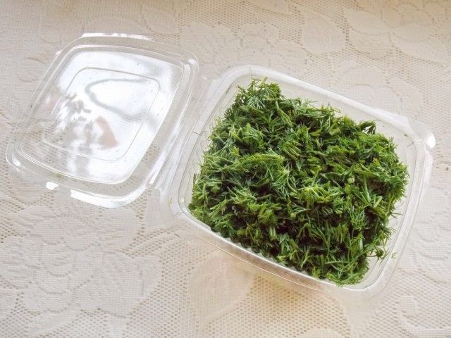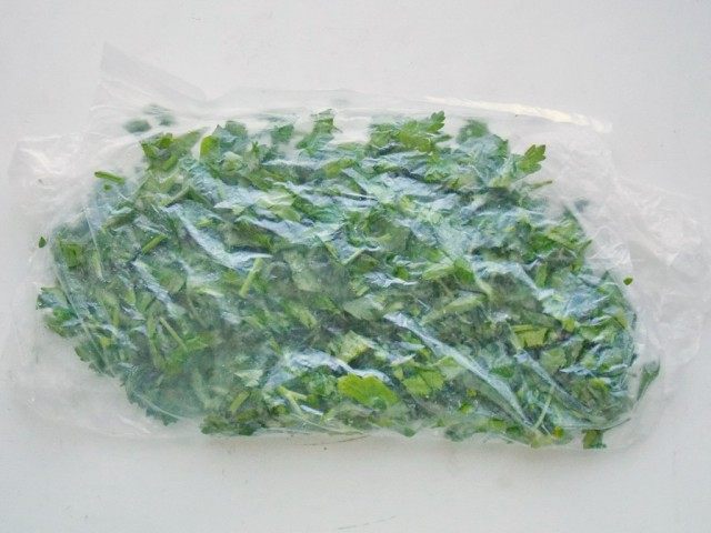 6. Подготовленную зелень мелко нарезаем, расфасовываем в выбранную тару и герметично закрываем. Если закрыть неплотно, то, во-первых, из зелени будет испаряться влага, во-вторых, она станет пропитываться посторонними запахами из морозилки. Стараемся, чтобы в тару попало как можно меньше воздуха: влага не станет вымерзать, и будет компактнее.